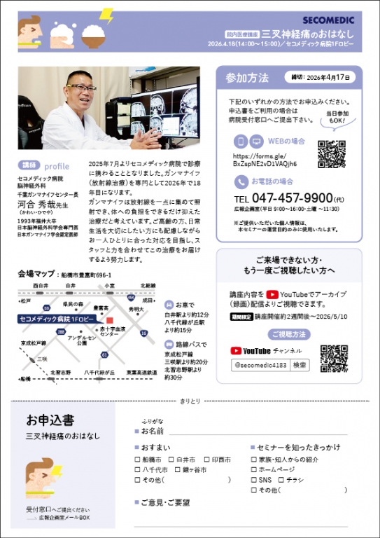 下記のいずれかの方法でお申込みください。当日参加もOKです。 WEBの場合https://forms.gle/BxZspNE2vD1VAQjh6 お申込書の場合下記よりお申込書をプリントの上、病院受付窓口へご提出下さい。