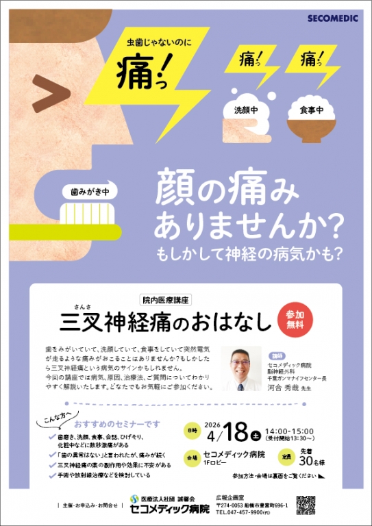 歯をみがいていて、洗顔していて、食事をしていて突然電気が走るような痛みがおこることはありませんか?もしかしたら三叉(さんさ)神経痛という病気のサインかもしれません。
