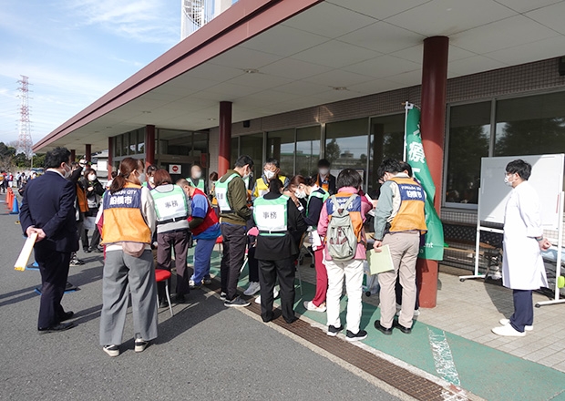 今回の訓練では、震度6強の地震が市内で発生したという想定のもと、院内対策本部の立ち上げをはじめ、病院前救護所の設置、トリアージ(傷病者の重症度振り分け)訓練、各治療エリアの運営、協力薬局との連携など、総合的な訓練を行いました。
